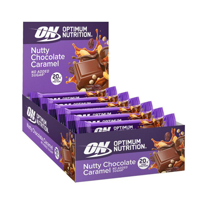 Krispig proteinbar med jordnötter och russin med ett lager med karamelkolasmak, med sötningsmedel. Mer information
