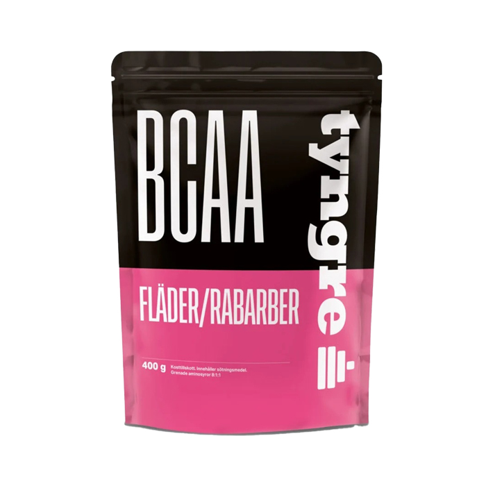 L-leucin, L-glutamin, L-citrullinmalat, L-isoleucin, L-valin, surhetsreglerande medel (citronsyra, natriumkarbonat), arom (Fläder, rabarber), sötningsmedel (aspartam*, acesulfam-K), emulgeringsmedel (solroslecetin), färgämne (rödbetsrött).
